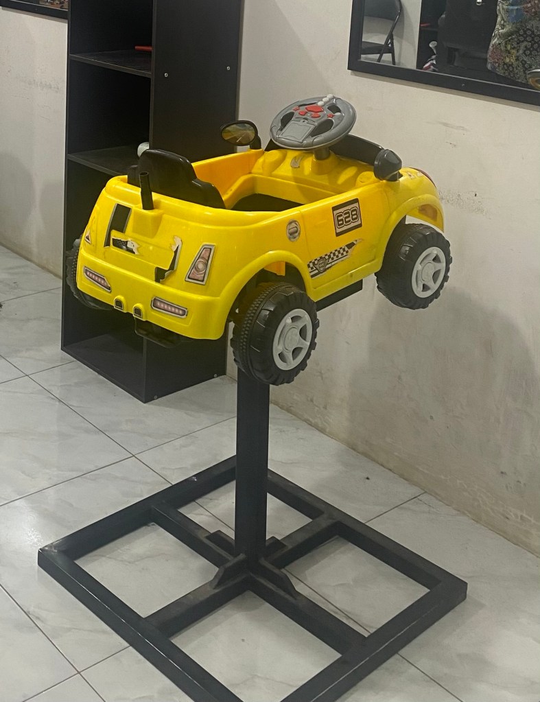 Benda itu mengingatkan saya akan kiddie ride, tunggangan yang berbentuk kuda, mobil, pesawat terbang atau superhero, yang dihubungkan dengan mesin yang membuat tunggangannya bergerak-getak ke kiri ke kanan atau maju mundur selama beberapa menit jika ke mesinnya dimasukan koin. Saya tak tahu apa Bahasa Indonesia bakunya untuk kiddie ride ini. Tunggangan koin?