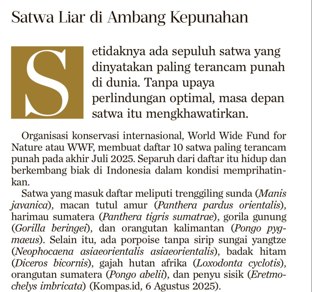 Awalnya adalah sebuah tajuk rencana di ePaper Kompas tanggal 13 Agustus 2025 tentang 10 satwa paling terancam punah menurut World Wide Fund for Nature atau WWF. Lima di antaranya adalah satwa yang ada di Indonesia dan dua di antaranya adalah spesies Orangutan yaitu Orangutan sumatera (Pongo abelii) dan Orangutan kalimantan (Pongo pygmaeus).