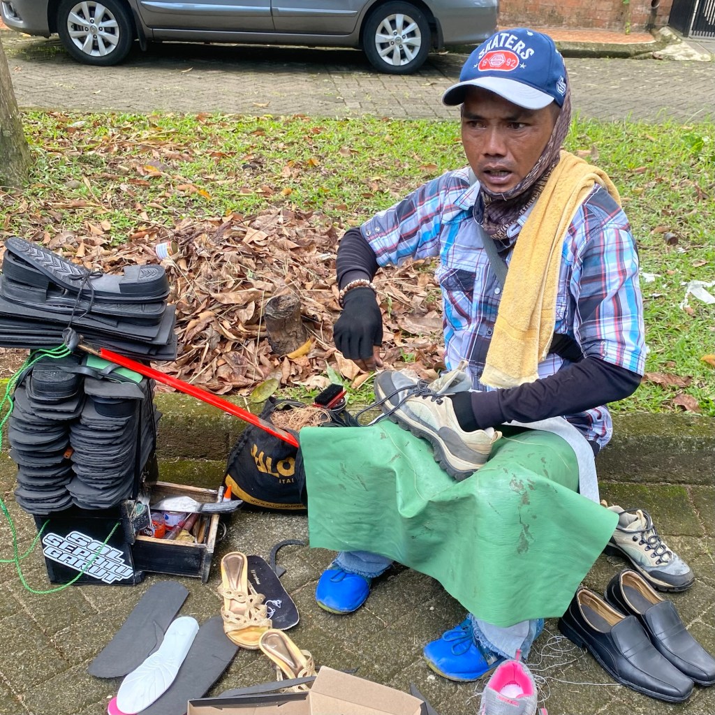 Ini bukan kali pertama kami menggunakan jasa bapak tukang reparasi sepatu ini. Saya sempat mengobrol sebentar tadi dengannya dalam Bahasa Sunda halus.
